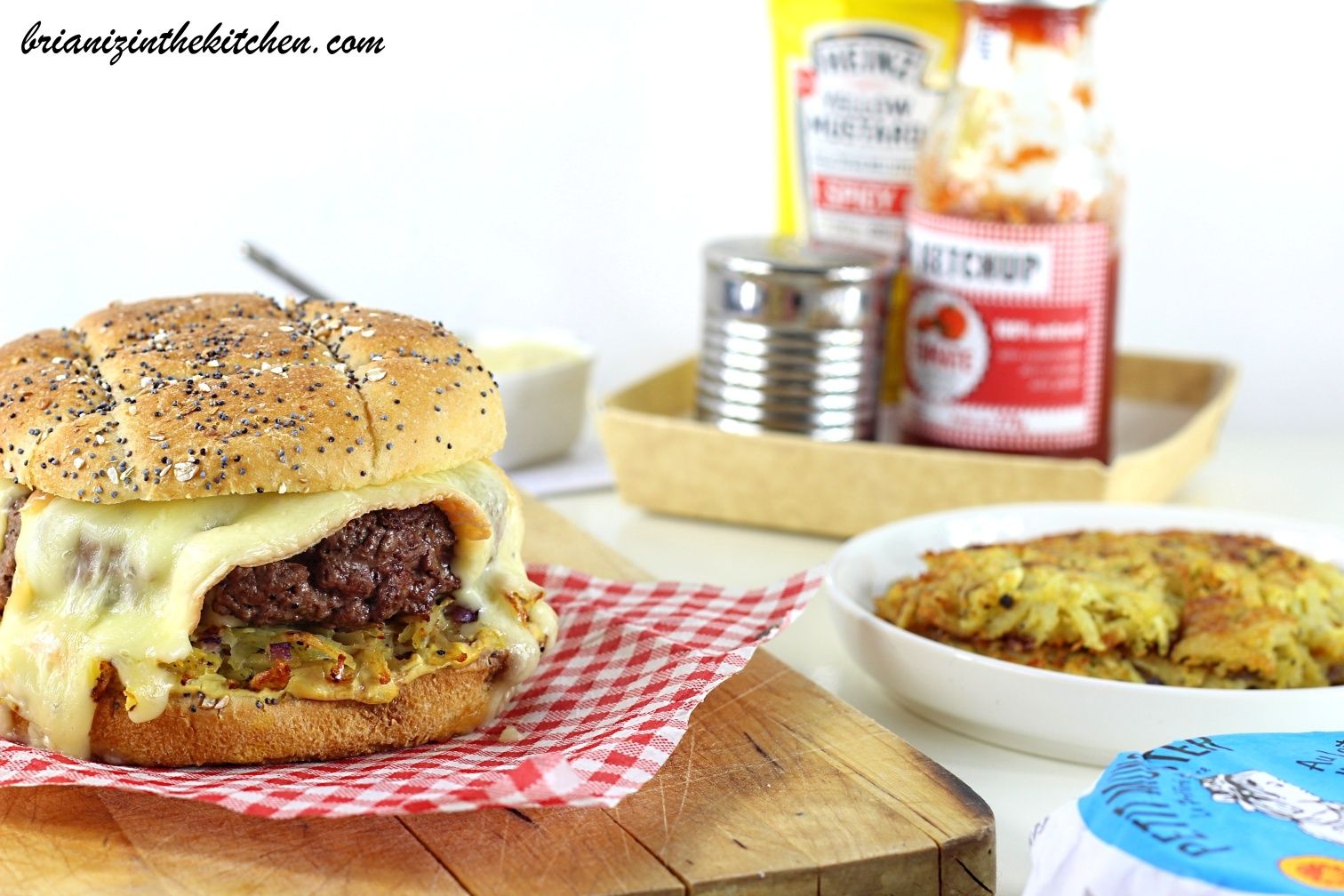 Cela fait un bon moment que je n'avais pas englouti un bon gros burger avec du fromage! Cela faisait un bon moment également que le Burger Alsacien du blog que J'ADOOORE Rock the Bretzel me faisait de l’œil mais cela fait un bon moment également que la flemme m'habite et je ne me sentais absolument pas d'attaque pour réaliser les petits pains bretzels qui seraient venus sublimer la recette. J'ai donc opté pour une version pour paresseux avec de bonnes röstis de pommes de terre et du Munster... C'était à tomber quand même :)