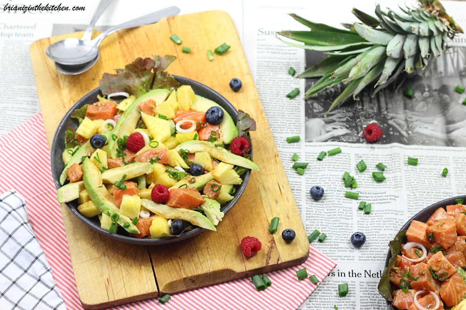 4. Répartissez les morceaux d'ananas dans les bols, faites de même avec les morceaux d'avocat et de saumon. Versez ensuite le fond de marinade restant dans le saladier sur les bols et servez avec pourquoi pas, quelques feuilles de salade, framboises et myrtilles (lavées en amont évidemment!). Voyage des papilles garanti!